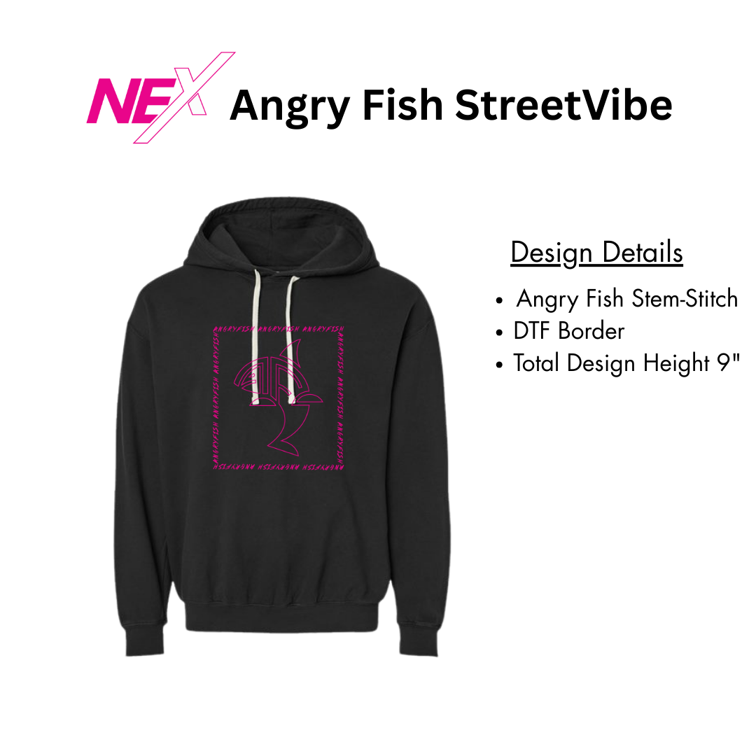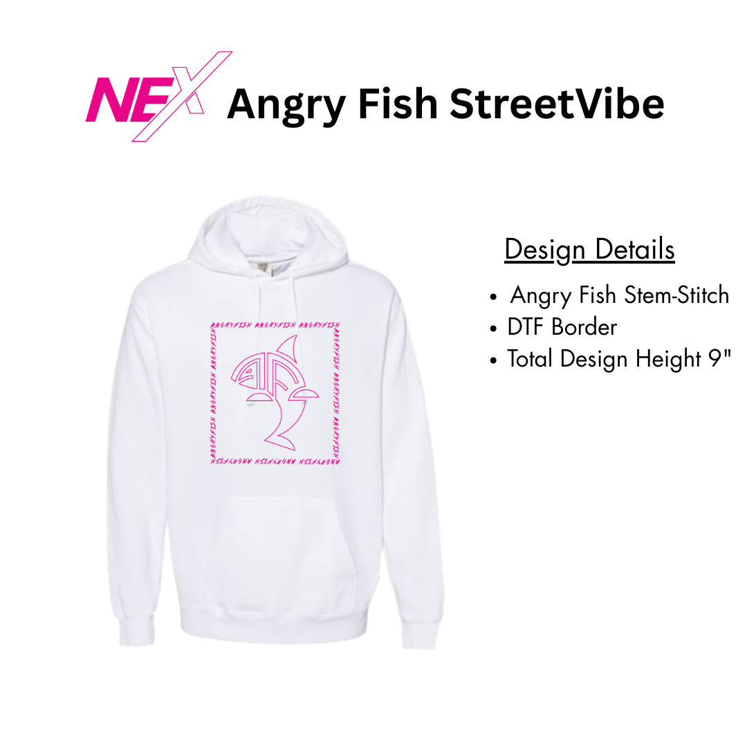 Step into the movement with the Angry Fish StreetVibe Hoodie from NEX. Featuring the bold Angry Fish stem-stitch design framed with a pink DTF border, this 9-inch graphic stands out with fearless energy. Available in classic black or clean white, the hoodie combines streetwear style with everyday comfort — built for those who live in motion.